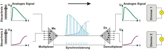 Durch die gestiegene Anzahl der zu steuernden Dimmerkreise häuften sich die Probleme bei der diskreten Verdrahtung mit dem großen Verdrahtungsaufwand, den Spannungsverlusten und der nicht vorhandenen Fehlererkennung. Eine Analogspannung bedeutet aber nicht zwangsweise, dass das man für jeden einzelnen Steuerkreis eine eigne Leitung legen muss. Man kann die Analogsignale auch Zeitversetzt hintereinander über ein einzelnes Adernparr übertragen. Man spricht hierbei von Multiplex. Auf der Empfängerseite ist es natürlich notwendig die einzelnen hintereinander eintreffenden Analogsignale wieder auf die verschiedenen Kanäle wieder zu verteilen. Mann spricht dabei von De-multiplexen das vor ca. 25 Jahren in der Lichttechnik Einzug gehalten hat. Nun konnten mit meist nur vier Adern mehrere hundert Analogwerte hintereinander zu den Dimmern versendet werden. Um den einzelnen Analogen Steuersignale des Lichtstellpultes den zugehörigen Dimmern zuzuordnen, ist noch eine Synchronisation notwendig. Dabei werden auf einem weiteren Adernparr Impulse übertragen um dem Empfänger mitzuteilen, wenn der nächste Analogwert für den nächsten Dimmerkreis übertragen wird. Das in unseren Raum wohl am längsten eingesetzte analoge Zeitmultiplex-Protokoll war D54 das von der Firma Strand unterstützt wurde. Mit D54 konnten die Spannungswerte für 384 Kreise übermittelt werden. Dazu wurden nur zwei Leitungen und die Schirmung benötigt, da zur Synchronisation eine überlagerte Negativspannung auf der Datenleitung diente. Als Steckverbinder wurde in der Regel der 3polige XLR-Steckverbinder verwendet und die maximale Kabellänge wurde mit 350m bei 0,34mm² Kabelquerschnitt angegeben.