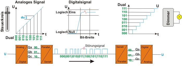Wandlung eines Analgsignals zum Digitalsignal, Übertragung und Rückwandlung. Der Empfänger definiert null und Einsen nur in bestimmten Tolleranzbändern. Verschleifungen des Signals durch u.a. Kabelkapazitäten können das Protokoll unlesbar machen.