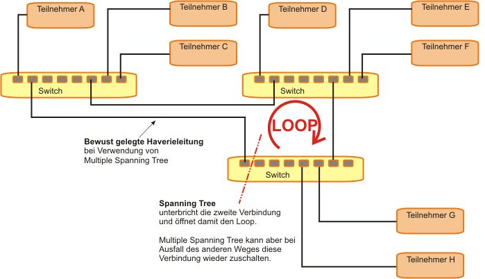 Wenn man von einem Switch eine Leitung zum nächsten legt, und von diesem zu einem weiteren und noch einige mehr, so kann es bei Unachtsamkeit schon mal vorkommen, dass man von einem Switch eine Leitung zurück zum ersten legt. Somit hat man einen Loop geschaffen, der die unangenehme Eigenschaft hat, dass die Datenpakete in diesem Kreis umherlaufen ohne jemals an das Ziel zu gelangen. Dieser Kreisverkehr wächst sehr schnell an, dabei werden die Switches vollständig ausgelastet und das Netzwerk kommt zum Erliegen. Um dies zu verhindern, hat man nach IEEE 802.1D/t die "Spanning Tree"-Technik eingeführt, die die Bildung von Schleifen im Netzwerk verhindert, indem sie redundante Wege erkennen und nach bestimmten Regeln diese Stecke abschalten.