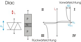 Einen Diac (Diode Alternatiting Currenbildt switch) auch Triggerdiode genannt, findet man als preiswertes Steuerelement bei Dimmern für den Haushalt und sollte in professionellen Dimmern nicht zu finden sein. Der Diac besteht aus zwei entgegengesetzten Dioden in Reihenschaltung. So weist der Diac zwei PN - Übergänge auf. Bei einer anliegenden Spannung ist eine Diode in Durchlass und die andere in Sperrichtung. Wird die Durchbruchspannung, die nur eine geringe Tolleranz aufweist und meist bei Werten zwischen 20 - 40 V erhältlich ist, überstiegen, so wird das Bauelement plötzlich leitend. Wie beim Überschreiten der Sperrspannung der Diode steigt der Strom Lawienenartig an und die Spannung am Bauteil bricht zusammen. Verringert sich die Spannung um etwa 5 V bis 10 V, so sperrt das Element wieder. Da das Bauelement Symmetrisch aufgebaut ist es Polaritätslos.
