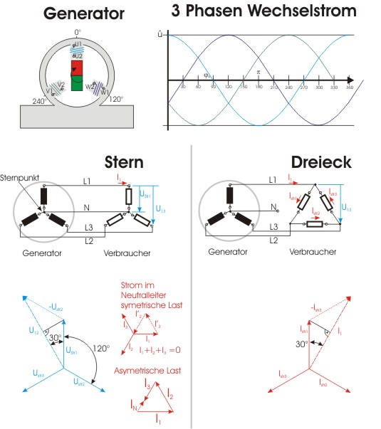 Wie aus dem Bild leicht zu erkennen ist, sind es einfach geometrische Anordnungen der Maschine, die für eine Erzeugung von drei Spannungen verantwortlich sind, die um 120° versetzt den Nullpunkt durchqueren. Wenn eine Maschine mit ihren Wicklungen entsprechend denen des Generators angeschlossen ist, so dreht sich die Maschine in derselben Richtung. Vertauscht man zwei x beliebige Phasen, so verändert sich die Reihenfolge mit der die Maschine seine Polpaare versorgt. Die Maschine wird also in die andere Richtung drehen. Und da hier soviel von drehen die Rede ist, spricht man bei dem dreiphasigen Strom, dessen Phasen um 120° versetzt sind auch von "Drehstrom".