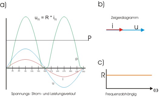 Der Strom folgt proportional der Spannung. Die Leistung ist dadurch immer im positiv und wird demnach auch Wirkleistung P mit der Einheit W bezeichnet.