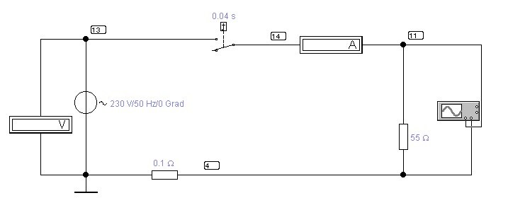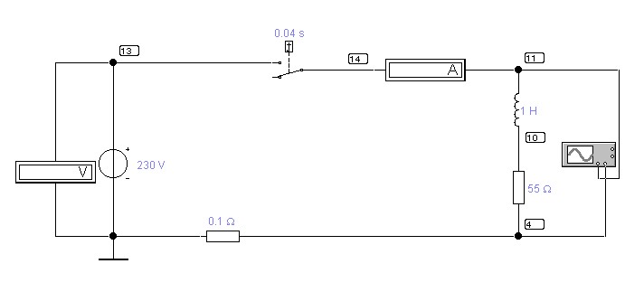 Simulationsschaltung einer RL Last. Auffällig hier die Öffnung des Schaltkreises mittels Umschalter, dessen Schaltkontakt zur Schonung der Bauteile besser mit Knotenpunkt 4 verbunden worden wäre.