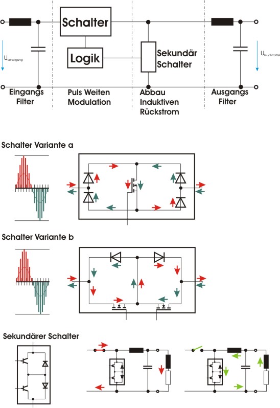 Um viele kleine Pulsblöcke aus der Versorgungsspannung herauszuschalten, benötigt man einen Leistungshalbleiter wie den IGBT. Dieser kann auf verschiedene Weise im Stromlauf plaziert werden, um die Spannung hinzu- und abzuschalten. In dem Übersichtsblockbild bezeichnen wir die (in Wirklichkeit komplexe) Leistungselektronik einfach mit "Schalter". Damit der Schalter die richtigen Pulse durchschaltet und nebenbei noch andere Schutz- und Zusatzfunktionen wahrnimmt, benötigt man eine mindestens ebenso komplexe Steuerungselektronik, die auf Grund der technischen Komplexität mit schnellen Microcontrollern aufgebaut sein wird und hier nur kurz "Logik" genannt wird. Um eine induktive Last, die empfindlich auf Abschaltvorgänge reagiert, ebenfalls betreiben zu können, steuert die Logik noch einen sekundären Schalter, mit dem der induktive Strom frei auslaufen kann. Wie bei einem konventionellen Dimmer schließt sich noch vor der Last ein Filterkreis an, der zwar erheblich kleiner dimensioniert sein kann als bei konventionellen Dimmertypen, aber dennoch für einen sauberen Sinus notwendig ist. Die Höhe der Taktfrequenz ist maßgeblich für den Aufwand, der für die Glättung - das Ausgangsfilter - benötigt wird. Wurde bisher mit 20 kHz getaktet, so waren viermal größere Drosseln am Ausgangsfilter notwendig als heute, wo mit 40 kHz getaktet wird. So sind die Spulen zwar kleiner, aber die Folge ist, dass der Eingangsfilter - der die Netzrückwirkung möglichst gering halten muss - einen wesentlich größeren Kondensator benötigt.