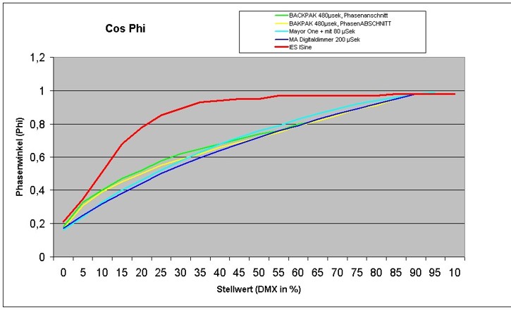 Ein Cos Phi von 1 wird als ideal betrachtet und mit dem Sinusdimmer als realisierbar definiert. Wie aus dem Diagramm ersichtlich ist, brilliert der Sinusdimmer gegenüber konventionellen Dimmern auch mit einem wesentlich länger anhaltenden Cos Phi von 1, aber in dem unterem Regelbereich unterhalb der 30%-Ansteuerung sackt auch hier der Cos Phi merklich ab und nähert sich schließlich den konventionellen Dimmern an.