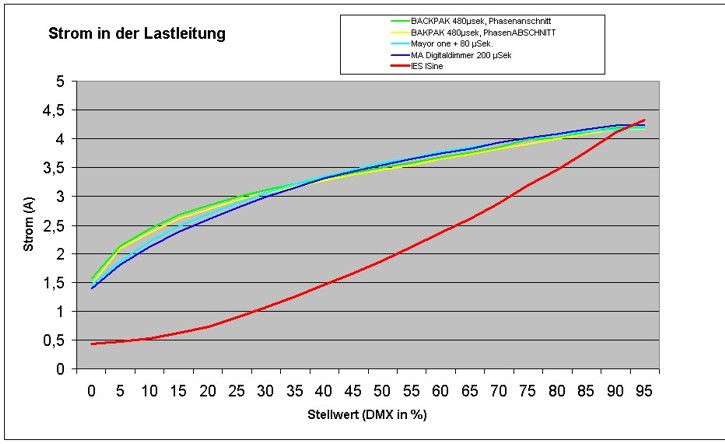 Das Ergebnis der Messung des Lastleitungsstrom über die Ansteuerung nicht in dieser Deutlichkeit nicht erwartet worden. Der Unterschied fällt aber auch deshalb gravierender aus, weil die Leistung in der Ansteuerkurve "Linear" sich unterschiedlich zu den konventionellen Dimmern verhält