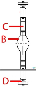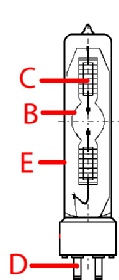 An den Wänden der Brennkammer werden 950° erreicht sowie ein Druck von typischen 10 Bar bis hin zu 35 Bar. Deshalb ist die Brennkammer aus Quartzglas gefertigt welches erst bei 1100°C erweicht. Dagegen ist im kalten Zustand der Druck ein kleiner Unterdruck, warum die Handhabung, also das Wechseln des Leuchtmittels im kalten Zustand ungefährlich ist. Durch diesen Unterdruck kann bei beschädigten Leuchtmittel erst das so genannte Luftziehen eintreten. In der Brennkammer befinden sich die Elektroden und die Füllung. Der Nabel der Brennkammer ist notwendig, da über Ihn beim Herstellungsprozess die Füllung der Kammer erfolgt und wir unromantisch Pumpstengel-Abzugsstelle kurz PST genannt. Die Elektroden, die aus Wolfram bestehen, sind symmetrisch ausgeführt also auf beiden Seiten gleich, denn das Leuchtmittel arbeitet ja mit Wechselstrom. Die Anordnung der Elektroden hat großen Einfluss auf das Temperaturprofil was sehr empfindlich reagiert. Zwischen den gegenüberliegenden Elektroden, bildet sich der Entladungsbogen. Demnach entspricht der Abstand der Elektroden dem Lichtbogen im heißen Betriebszustand. Damit die Elektroden mit Strom versorgt werden aber keine Luft in die Brennkammer gelangt, werden die Lampenschäfte benötigt, die den Übergang von den Elektroden zu den Lampensockel bilden aber die Brennkammer abgedichtet hält. Dazu werden Molybdänfolien benötigt, da diese sich von den Metallen am wenigsten ausdehnen. Würden die Elektroden einfach weitergeführt werden, dann würde das Elektrodenmetall mit 10mal so großen Ausdehnungskoefizient das Glas einfach wegsprengen. Das Molybdän dagegen wird als 20µm dickes Bändchen gefertigt, das über der Fläche zu wenig Kraft aufbringt um das Glas wegzusprengen und and den Kanten sich eher in das Glas schneidet statt es wegzusprengen. Diese Molybdänfolie muss aber auch noch den Leuchtmittelstrom transportieren und bildet somit einen der kritischen Bauteile.