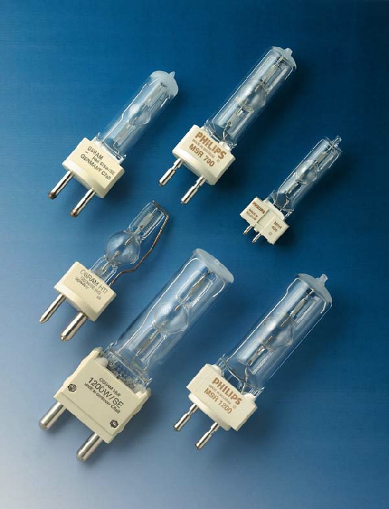 Und da auch hier wie bei dem Halogenleuchtmittel mit Wolframfaden ein Halogenkreisprozess stattfindet, um das schwärzen des Glaskolbens zu verhindern, spricht man bei diesem Entladungslampentyp von der Halogen Metalldampflampe. Nebenbei, der Halogenkreisprozess wird nicht nur bei zu kalter Lampe unterbrochen, sondern auch wenn das Leuchtmittel zu heiß wird. Aber nicht nur die Tagelicht ähnliche Farbtemperatur ist Ausschlag gebend, sondern auch die ca. vier mal höhere Lichtleistung gegenüber der Halogenlampe und dann noch eine 20 mal größere Lichtdichte, was bedeutet das das Licht aus einem kleineren Punkt herausstrahlt und damit für die anschließende Optik schon eine fast ideale Punktlichtquelle bedeutet. Und wollte man mit der Wolfram-Halogen-Leuchte mittels Konvertierung den Typ Tageslicht erreichen, verringert sich die Lichtleistung nochmals erheblich aufgrund der Transmissionverluste der Folie. Natürlich gibt es auch Entladungslampen die versuchen den Halogenlampen von der Farbtemperatur zu ähneln wie z.B. die CDM Leuchtmitteltypen, oder gar mit nur einer Farblinie ganz auf gestalterische Wirkung setzen wie die gelb leuchtende Natrium Niederdruck Lampe. Jedoch wollen wir uns hier hauptsächlich mit den Halogenmetalldampflampen bzw. deren notwendigen technischen Umfeld beschäftigen um die Unterschiede in einem Scheinwerfer zu erläutern. Osram war einer der Vorreiter in der Entwicklung der Metalldampflampen und hatte ihrem Produkt den Namen HMI gegeben, während Philips z.B. den Leuchtmitteltyp mit MSR bezeichnet. Bleibt noch abschließend zum Leuchtmittel zu bemerken, das Sie auch UV-Strahlung abgeben. Dementsprechend sind auch die BG Vorschriften für Scheinwerfer oder die DIN auch Eindeutig. Erschwerend kommt hinzu das je nach verwendeten Glas ein Leuchtmittel mehr oder weniger UV abstrahlen kann, da durch das verwendete Glas eine UV-Filterung beginnen kann. Erwähnungswert ist aber an dieser Stelle das durch die UV-Strahlung, bzw. gerade beim Zünden durch die Funkenstrecke, Luft von O2 zu O3 umgewandelt werden kann und somit eine Belastung darstellen könnte. Jedoch die Werte liegen in der Regel unter den der MAK-Werten. Nebenbei, man kann Ozon nicht riechen, aber durch O3 entstehen auch Stickoxide die man dann als Ozonriechen interpretiert wie beim einen Kopierer auch.