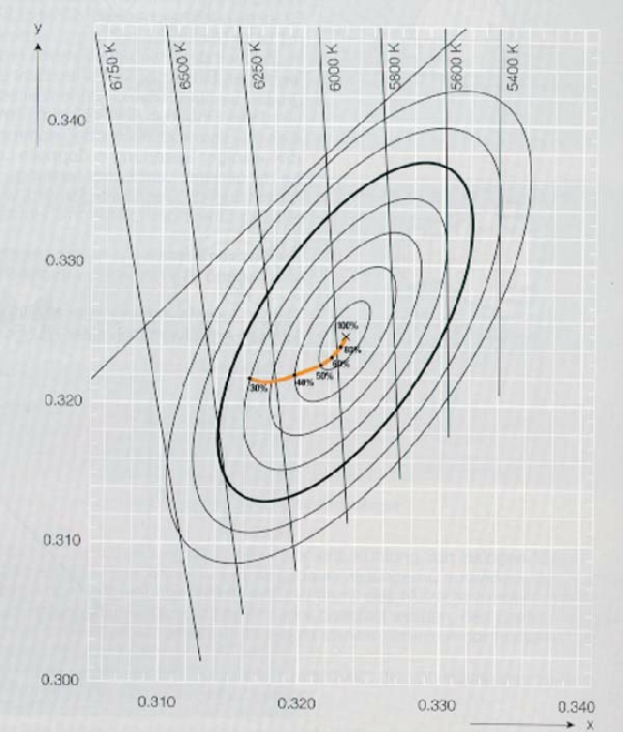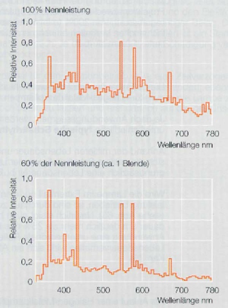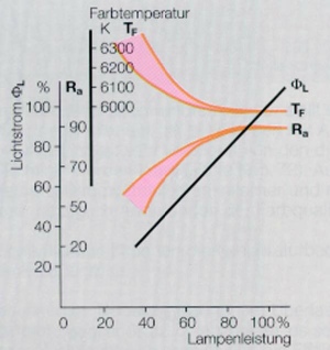 Deshalb ist auch beim eingeschränkten Dimmen darauf zu achten, das das Dimmen nur zeitlich begrenzt erfolgt und dann auch wieder unter Vollast gefahren wird, damit eine Erholung der zum stocken gekommenen Prozesse erfolgen kann. Im Gegensatz zu Wolframfaden-Leuchtmitteln kann bei Entladungslampen bei eingeschränkten Dimmbereich erheblich die Lebensdauer des Leuchtmittels leiden und Schwärzung des Kolbens oder Elektrodenkorrosion auftreten. Noch wichtiger ist das das Leuchtmittel immer bei Volllast gestartet wird, damit zumindest in der Hochlaufzeit die Prozesse in Ihren Normalbereich hineingefahren werden können. Eine Dimmeinstellung sollte also nie beim Starten anliegen und erst nach der Anlaufphase frühestens begonnen werden. Aus diesem Grund lehnen in der Regel Leuchtmittelhersteller eine Gewährleistung bei Dimmbetrieb für die Lebensdauer ab. Was Für Halogen Wolfram Leuchtmittel gilt, ist bei der Entladungslampe leider nicht der Fall, denn die Lebensdauer des Entladungsleuchtmittel leidet unter den Dimmvorgang und erhöht auf keinen Fall die Lebensdauer. Aus diesem Grund ist das mechanische Dimmen von Entladungslampen immer noch die erste Wahl.