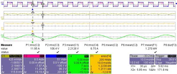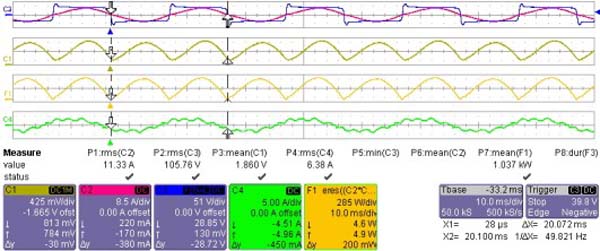 Beim Elektronischen Vorschaltgerät erkennen wir sofort, das die Ausgangspannung und Strom viel schneller oszillieren, hier mit 170 Hz. Jetzt ist nicht nur die Spannung rechteckförmig und das noch ohne Überschwinger, sondern der Strom Phasengleich auch. Spannung mal Strom ist die Leistung, und so wird klar, das die Leistung des am Leuchtmittel kaum noch pulsiert. Und das Luxmeter bestätigt den Effekt. Die Beleuchtungsstärke ist fast gleich bleibend und ist um 19% stärker als beim konventionellen Vorschaltgerät. Durch die Regelung bleibt der Leuchtmittelstrom Konstant auch wenn die Betriebsspannung sich verändert. Die Hochlaufzeit des Leuchtmittel beträgt nun nur noch 60 Sekunden.