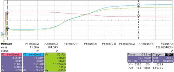 Ein Vergleich der Betriebsgrößen zeigt deutlich die Unterschiede von EVG und KVG. Betrachten wir uns zunächst das KVG, so können wir deutlich erkennen wie der Strom einen Sinusverlauf vollzieht, während die Spannung mehr rechteckförmig erscheint. Dadurch erhalten wir eine Pulsierende Leistung die nach RMS 1000W beträgt. In dieser Konfiguration würde das für das Leuchtmittel eine 10-20% geringere Lebensdauer bedeuten. Weiterhin kann man nun an der zweiten Zeile deutlich das Schwanken des Luxmeter erkennen was natürlich den Flickereffekt ausmacht. Und zu guter letzt erkennt man in der vierten Zeile eine hohe Stromwelligkeit. Das Nächste Bild zeigt dann die Zeit für das Hochlaufen des Leuchtmittels und benötigt hier mit dem KVG 100 Sekunden.