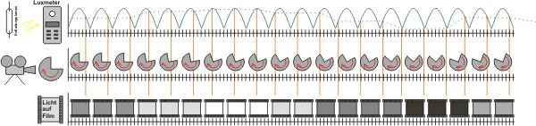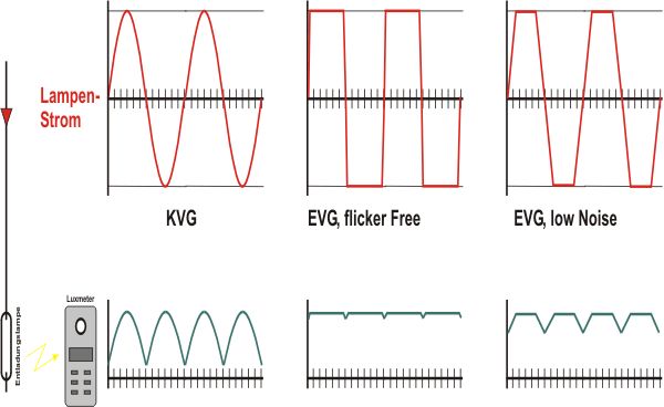 Wie wir bereits lesen konnten, erzeugt das EVG eine Rechteckspannung. Diese Rechteckspannung liegt nun am Leuchtmittel an. Der Vorteil der Rechteckspannung zur Sinusspannung ist, dass die Übergänge von 100% positiver Spannung zu 100% negativer Spannung sehr kurz um die 10µsek sind gegenüber der der Sinusspannung. Unsere Augen sind träge und sehen den Unterschied zwischen Konventionellen und elektronischen Vorschaltgerät nicht, aber elektronische Abtastgeräte oder das periodische öffnen des Verschlusses einer Filmkamera haben die Eigenschaft immer eine Momentaufnahme, wie ein Blitzlicht, aufzunehmen sprich abzutasten. Wenn nun die Frequenz der Abtastung z.B. genau auf den 80% Wert der ansteigenden Sinusspannung zu liegen kommt, dann ist das aufgenommene Bild nur 80% so hell, obwohl der Scheinwerfer 100% Eingeschaltet ist. Irgendwann verschieben sich die Fenster der Abtastung durch die Tolleranzen der Bauelemente, und kommt dann z.B. bei 100% Licht oder 40% Licht zum liegen. Die Folge dieser Schwebungen sind fickernde, flackernde oder blinkende Lichtverhältnisse. Man kann trotzdem Konventionelle Vorschaltgeräte verwenden, wenn die Filmkameras mit ihrer Bildfrequenz synchronisiert werden und der Sektorenwinkel der Umlaufblende richtig eingestellt wird.