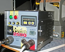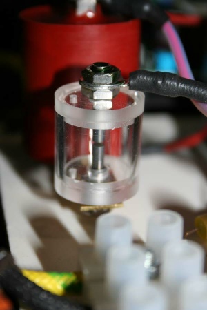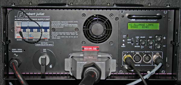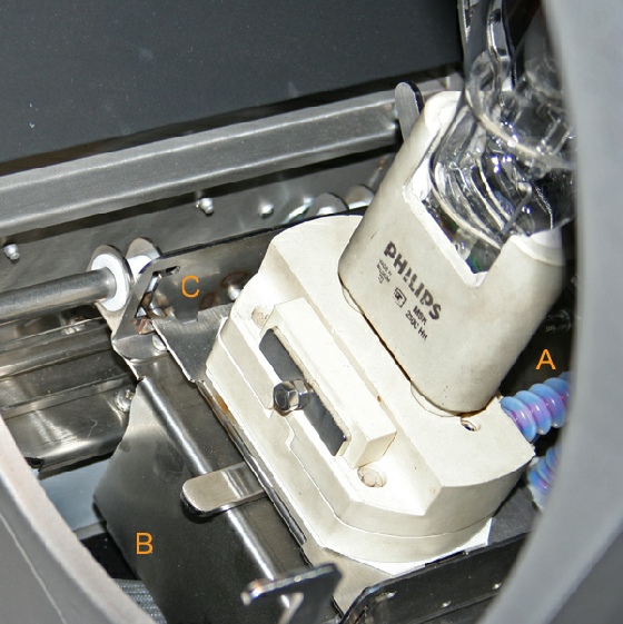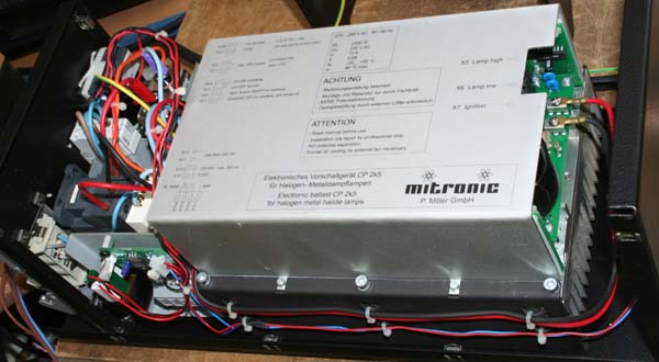 Die Kapazität CB ist nicht als ein Bauteil wie ein Kondensator vorhanden, sondern bildet sich aus den Zuleitungen, den Sockelstiften bzw. den Elektroden des Leuchtmittels. Diese Kapazität belastet bereits das Zündgerät. Ein Scheinwerferhersteller hat die Leitungskapazitäten minimiert, indem er das Zündgerät in zwei Baugruppen unterteilt hat. Dabei ist der letzte Hochspannungsteilmodul zusammen mit dem Leuchtmittel auf den gleichen Schlitten montiert. Dadurch wird erreicht, das die Kabel zum Leuchtmittel sehr kurz gehalten werden können. Dann werden die Kabel auch nicht bewegt als wenn der Schlitten zum fokussieren verfahren wird und das Zündgerät im Boden des Scheinwerfers gelagert ist. Und Hochspannungskabel ist sehr empfänglich bei mechanischer Belastung die Durchschlagsfestigkeit zu verlieren. Getopt wird dann nur noch die Möglichkeit 2,5KW und 4KW Leuchtmittel einzusetzen, wobei bei der Sockelhöhenverstellung ein Schalter dem Vorschaltgerät signalisiert welcher Leuchtmitteltyp Anwendung eingesetzt wird.