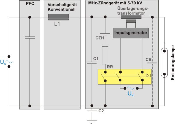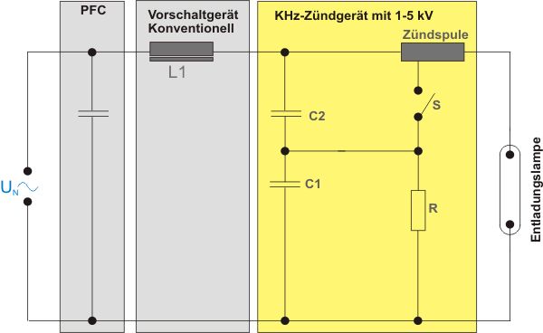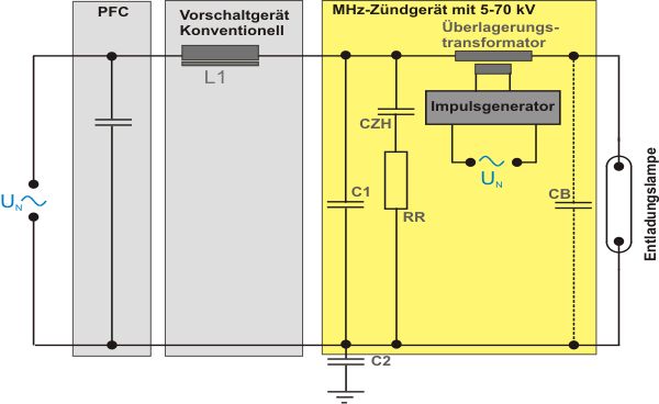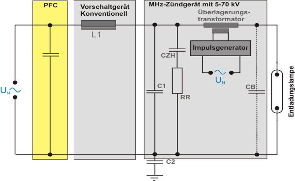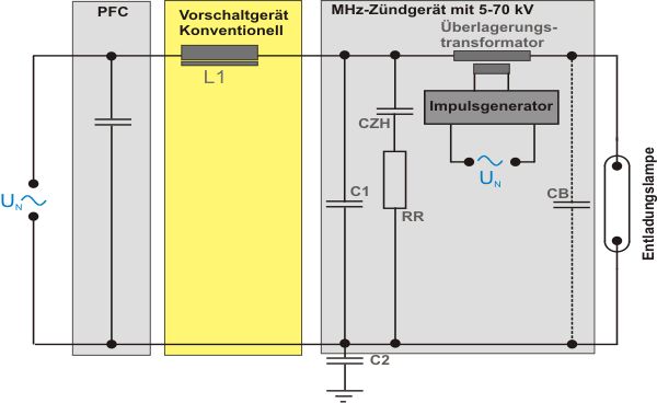 Der Kondensator C1 wiederum soll die hochfrequente Stoßspannung vom Stromversorgungsgerät fernhalten. Damit C1 wirksam arbeiten kann, muss er für Hochfrequenzen geeignet sein und groß gegenüber CB sein. Der Zündhilfskondensator CZH soll das Leuchtmittel praktisch verzögerungsfrei mit Strom versorgen können, damit beim langsam ansteigenden Strom der 50 Hz Versorgungsspannung dennoch der Lichtbogen aufrecht gehalten werden kann. In einigen Fällen wird der Zündhilfskondensator so groß gewählt, dass mehr als die normale Lampenleistung entsteht. In diesen Fällen ist eine Elektromechanische Abschaltung mittels Relais erforderlich, die diese Kapazität nur zum Zünden dazuschaltet und danach aus dem Stromkreis wieder herausnimmt, so das das Leuchtmittel nur mit der Nennleistung arbeiten muss.