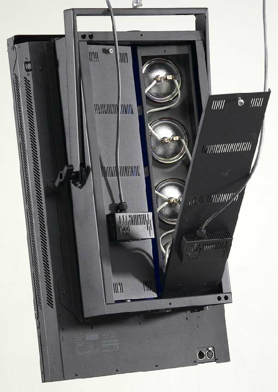 Mann kann aber auch einen Dimmer auf 110V limitieren, so ist auch ein direkter Betrieb an einem Dimmerkreis möglich. Aber Achtung, wegen dem hohen Einschaltstrom im kalten Zustand ist es sinnvoll das Leuchtmittel vorzuglühen, wenn der Dimmer keine Einstellung von Responseverhalten erlaubt. Denn im Ungünstigsten Moment, beim ersten Einschalten kann der Phasenanschnitt genau im Scheitelpunkt anliegen, was bekanntlich bei einem Phasenanschnittsdimmer bei 90° erfolgt und damit der Scheitel der 230V Netzspannung anliegt, denn die 110V Begrenzung erfolgt ja nur Leistungstechnisch, die Spannungsform selbst bleibt ja erhalten, es sei denn man ist stolzer Besitzer eines Sinusdimmers. Folglich werden bei Blinder öfters die Leuchtmittel gewechselt, aber auch weil dieses Leuchtmittel aufgrund seiner hohen Leuchtdichte nur eine bescheidene Lebensdauer von ca. 25 Betriebsstunden aufweist. Dazu kommt jetzt die unangenehme Eigenschaft, das in einer Reihenschaltung dann bekanntermaßen alle hintereinander geschalteten Leuchtmittel dunkel sind. Nun ist die Frage welches Leuchtmittel ist das defekte. Dabei kann man dem Problem mit Komfort begegnen, indem das Blindergehäuse parallel zu jedem Leuchtmittel eine Glimmlampe aufweist, die dann zuverlässig das defekte Leuchtmittel anzeigt. Oder man muss es mit einem Durchgangsprüfer jedes Leuchtmittel "ausklingeln". Gerade bei Selbstbauten Blindern die von einem Gastspiel mitgebracht werden und mal schnell eben noch dazugehängt werden soll, wie aber auch bei der Handhabung, wenn mal schnell das Leuchtmittel ausgetauscht werden soll, ist wie auch bei einigen low Kost Produkten, ein gewisses Gefahrenpotential möglich. Denn im Gegensatz zu "normalen" Scheinwerfern, deren Leuchtmittel in einem Sockel eingesetzt wird, der Berührungssicher aufgebaut ist, weisen diese Blinder-Leuchtmittel meist nur Schraubklemmen auf. Öffnet man dann das Gehäuse ohne den Netzstecker zu ziehen, kann man sehr leicht an die blanken Drähte der Stromversorgung der Leuchtmittel gelangen. Insbesondere weil die anliegende Spannung nicht sichtbar ist und somit die Gefahren oft unterschätzt wird. Aus diesem Grunde haben sich auf dem Markt Blindertypen etabliert, die beim öffnen des Gehäuses die Stromversorgung allpolig zwangsweise trennen.