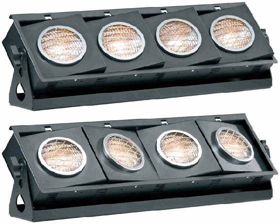 Der Blinder beinhaltet als Scheinwerfer ein PAR-Leuchtmittel. Die Integration des Parabolspiegel mit dem Leuchtmittel zu einer Einheit auch genannt Sealed Beam (abgedichteter Lichtstrahl) oder Pressglaslampe genannt hat einige Vorteile wie z.B. das diese geschlossene optische Einheit ideal gegen Staub, Nässe und anderen Einflüssen geschützt ist. Außerdem ist Sie sehr einfach zu handhaben. So wurde dieses kompakte Leuchtmittel für die verschiedensten Fahrzeuge entwickelt. Eines davon ist das ACL Leuchtmittel (Aircraft Landing Lamp). Es ist mit Schraubverbindungen zum Anschluss der Stromkabel ausgeführt und benötigt deshalb noch nicht einmal ein Sockel, sondern nur noch ein Gehäuse. Diese Bauart des Leuchtmittels das sozusagen vorjustiert bzw. fokussiert ist, brauch nur noch irgendwie in einem Gehäuse festgehalten zu werden und schon ist der Scheinwerfer fertig. Ideale Vorraussetzung um selbst einmal einen Scheinwerfer zu bauen. Diese ACL Leuchtmittel weisen einen für Parabolspiegel basierenden Scheinwerfer einen nicht so typischen Abstrahlwinkel von um die 11° auf. Meist wird die ACL in einer PAR 36 Größe mit 250W angeboten, aber auch PAR 64 mit 600W ist möglich. Um ohne Transformator auszukommen schaltet man acht ACL Leuchtmittel in Reihe um Sie direkt an 230V anzuschließen. Aber auch 4er Kombinationen mit 110V sind üblich, insbesondere bei Gastspielen aus Übersee deren Versorgungsspannung ohnehin nur 110V beträgt. Eine solche 4er Kombination mit einem Schukosteckverbinder auszustatten ist denkbar ungünstig. Aber man kann zwei Einheiten a 110V in Reihe zu schalten. Dazu hat man vielerorts einen gelben CEE Einpoligen Steckverbinder ausgewählt. Es sind Adapter im Umlauf, die von einmal Schuko auf zweimal gelbe Steckverbinder, die in Reihe geschaltet sind aufsplitten.