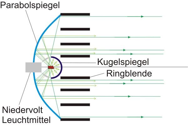 Deshalb spendiert man einem Parabolspiegelscheinwerfer auch gerne eine Ringblende, die nichts anderes zur Aufgabe hat, alles Licht was nicht parallel aus dem Scheinwerfer heraustritt abzuschatten. So gesehen wäre eine Ringblende mit möglichst vielen und langen Ringen optimal.