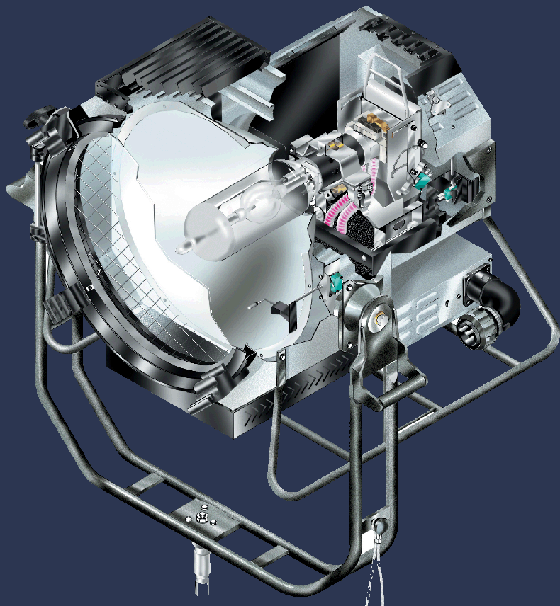 Eine Lichtquelle für einen Parabolspiegel muss aber nicht zwangsläufig ein Niedervolt-Leuchtmittel sein. Auch andere Lichtquellen besitzen eine beinahe Punktlichtquelle. So sind z.B. Entladungslampen ebenfalls für eine Parabolspiegelkonstruktion gut geeignet. Xenon Leuchtmittel sind in Ihrer Farbtemperatur sehr konstant, arbeiten mit Gleichstrom und sind demnach flickerfrei und sind für optische Belange mit einer sehr gute kleine Punktlichtquelle mit sehr hoher Lichtdichte ausgestattet. Wobei die ersten Eigenschaften mehr für Projektoren interessant sind, nutzt man dennoch die Punktlichtquelle um mit großen Parrabolspiegeln ein Lichtfinger durch die Nacht wandern zu lassen. Einen Effekt der oft Open Air eingesetzt wird, aber auch bei großen Shows sind solche surch lights (Such Lichter) immer öfters auch verteilt im Zuschauerbereich zu finden um Raumgröße und Tiefe zu erzeugt, wenn die Kamera einen Zusschauerschwenk vollzieht. Die Skytracker oder Suchscheinwerfer, lassen in der älteren Generation auch Assoziationen zu Flackscheinwerfern hochkommen. So sind diese Scheinwerfer nicht nur als Party-Weg-Richtungsanzeiger immer beliebt, sondern werden oftmals als Störung empfunden. Wenn man solch einen Scheinwerfer im freien betreiben möchte, sollte man auch einen Gedanken verschwenden, das man damit Licht Emmitiert und es gibt ein Emmisionsschutzgesetz. Also deshalb ist es sinnvoll vorher mit den Behörden Kontakt aufzunehmen um einen Solchen Einsatz zu besprechen. In der Nähe von Einflugschneisen bei Flughäfen ist es offensichtlich, aber wie sieht es aus bei den Flugschneisen von Zugvögeln? Denn es ist nicht das erste und wird gewiss auch nicht das letzte Gutachten von Ornithologen geschrieben werden, ob diese Strahler den Vogelzug beeinflussen. Ist in dr Bevölkerung dieses Thema sensibilisiert worden, kann man mit den Verantwortlichen sich bestimmt auf eingeschränkte Einsatzzeiten einigen, z.B. wenn mit Zugvögeln gerechnet werden muss. Innerhalb der Halle sind jedoch natürlich keinerlei Einschränkungen zu erwarten, außer das bei diesem Leuchtmittel – einer Xenonlampe – der Leuchtkörper bereits im erkalteten Zustand unter großen Druck seht und deshalb explodieren kann. Bei Xenon-Leuchtmittel gilt generell Schutzweste, Handschuhe und Gesichtsschutz. Versteht sich von selbst, dass man solch ein Leuchtmittel nicht austauscht, wenn nebenan Zuschauer sitzen. Bei dieser Einsatzart stört nicht so sehr das direkt nach vorne abstrahlende Licht wie es im Theater stören würde, wo man fast wie mit einem Skapell mit diesem Scheinwerfer umgehen muss denn jedes ausfransen des Lichtes reißt die Bühne auf. Deshalb wird hier gerne auf eine Ringblende verzichtet. Vielleicht damit man nicht direkt hineinschauen kann wird manchmal ein Tophead eingesetzt.