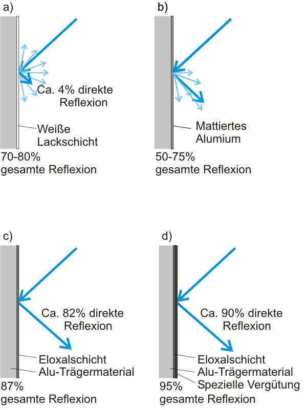 d) spiegelnde Refexion mit wirkungsgrad erhöhender Spezialbeschichtung.