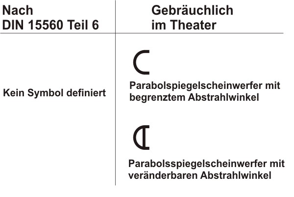 Die DIN 15560-1 definiert nun diese Gruppe von Scheinwerfer die hauptsächlich über rotationssymetrischer asphärischer Holspiegel vorzuggsweise mit oder ohne Gegenspiegel arbeiten. Während die Din 15560 Teil 6 diesem Scheinwerfertyp nicht als Symbol aufführt, haben sich dennoch folgende Symbole herausgebildet.