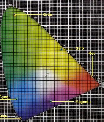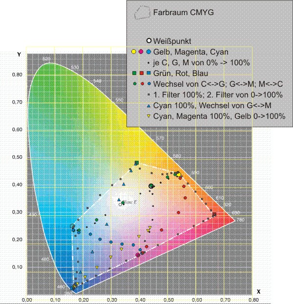 Wie haben einmal die ein Farbmischsystem CMYG gemessen und in den DIN Farbraum eingetragen. Im allgemeinen werden die RGB Farben solo wie z.B. rot in den Strahlengang zur 100% Sättigung gefahren und man erhält einen Farbort. Dies wiederholt man bei den anderen zwei Grundfarben grün und Blau und erhält so ein drei Farborte. Dann werden dann diese Farbpunkte mit einer Linie verbunden und alle Farben die sich innerhalb des gebildeten Dreiecks befinden können mit diesem Farbmischsystem dargestellt werden. Jedoch muss man bei CMY Farbmischsystem nicht nur die einzelnen Solofarben bestimmen, man muss zusätzlich noch die Farborte Rot Grün und Blau ermitteln. Denn der Farbraum basiert auf unsere drei Zapfenstimmulierung auf rot Grün und blau und damit wird auch der eingeschlossene Farbraum definiert. Man kann an der Messung erkennen dass wenn man das System mit einer weiteren Farbe erweitert, so kann sich der darstellbare Farbraum erweitern.