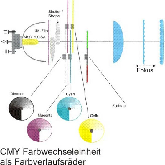 Leider können die dichroitischen YMC Mischsysteme die Farben von Folien nicht immitieren (Ausnahme VL). So ist im Theater ein Folienbasierendes System, solange auch die Geräuschentwicklung tragbar ist, vorzuziehen.