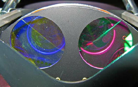 Unter Reflektierende Filter verstehen wir die dichroitischen Farbfilter. Ein dichroitischer Filter besteht in der Regel aus ca. 20 bis 50 extrem dünnen Schichten, die auf einen Glaskörper, meist wird Borosilikat-Glas, das eine Arbeitstemperatur bis 400° C erlaubt, in Vakuumtechnik aufgetragen werden. Die Stärke der Schichten muss also sehr exakt und über die Fläche äußerst homogen aufgetragen werden. Auf diese Weise kommt - je nach Betrachtungswinkel - die Vielfalt der Farben zustande.