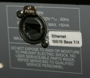Lichtstellwerk mit Netzwerkanschluss für Thin-Ethernet, AUI kennzeichnet den Anschluss für ein Thick-Ethernet-Transiver.