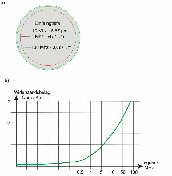 a) je höher die Frequenz, um so kleiner ist der wirksame Querschnitt für den Strom