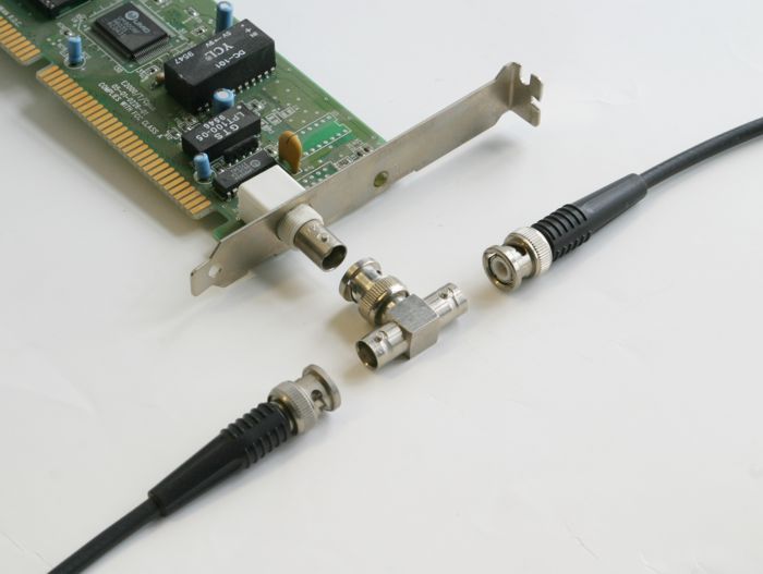 Netzwerkkarte wird mit einem T-Verbindungsstück in den Strang geschaltet. Die Steckverbinder sind als BNC-Steckverbinder (Bayonet-Neill-Concelmann) bekannt.